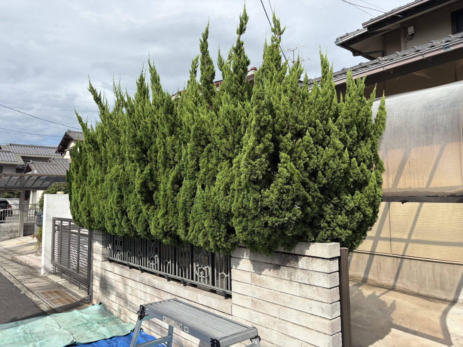 対象となったのは、敷地境界のフェンス沿いに植えられたカイヅカイブキの生垣です。お客様からは、日々の忙しさから剪定のタイミングを逃してしまい、気がついた時には枝が道路側まで大きく張り出してしまっていたというお悩みを伺いました。近隣の方や通行人の方の邪魔になっていないか、ずっと不安に感じていらっしゃったそうです。